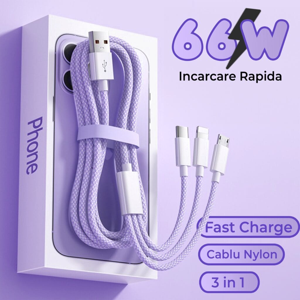 - Tip de cablu: 3 in 1, inclusiv USB, Type-C, Lightning si Micro-USB.