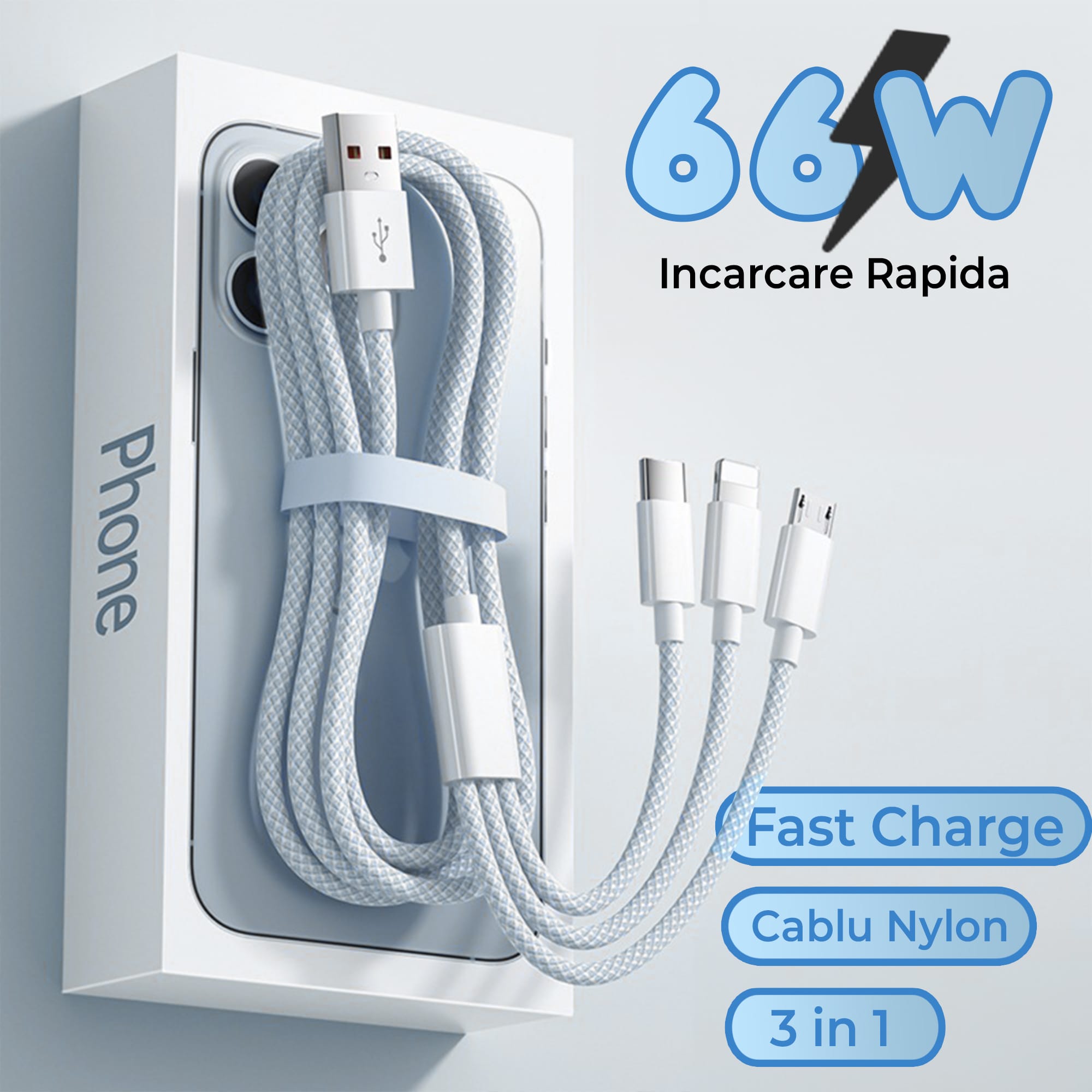 Cablu Date si Incarcare Rapida Timebox, 3 in 1, QC 3.0, 66W, USB, Type-C, Lightning, Micro-USB, 2m, Compatibil iPhone, Samsung, Huawei, Gri