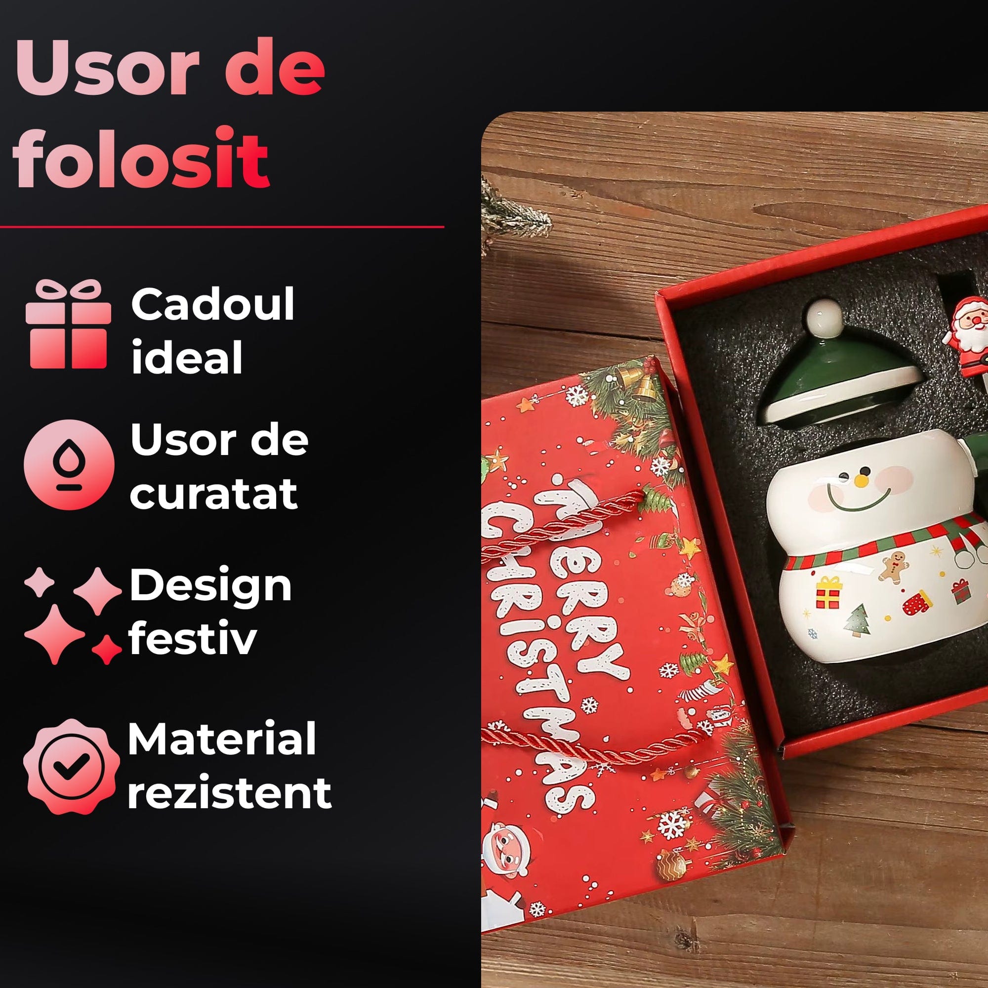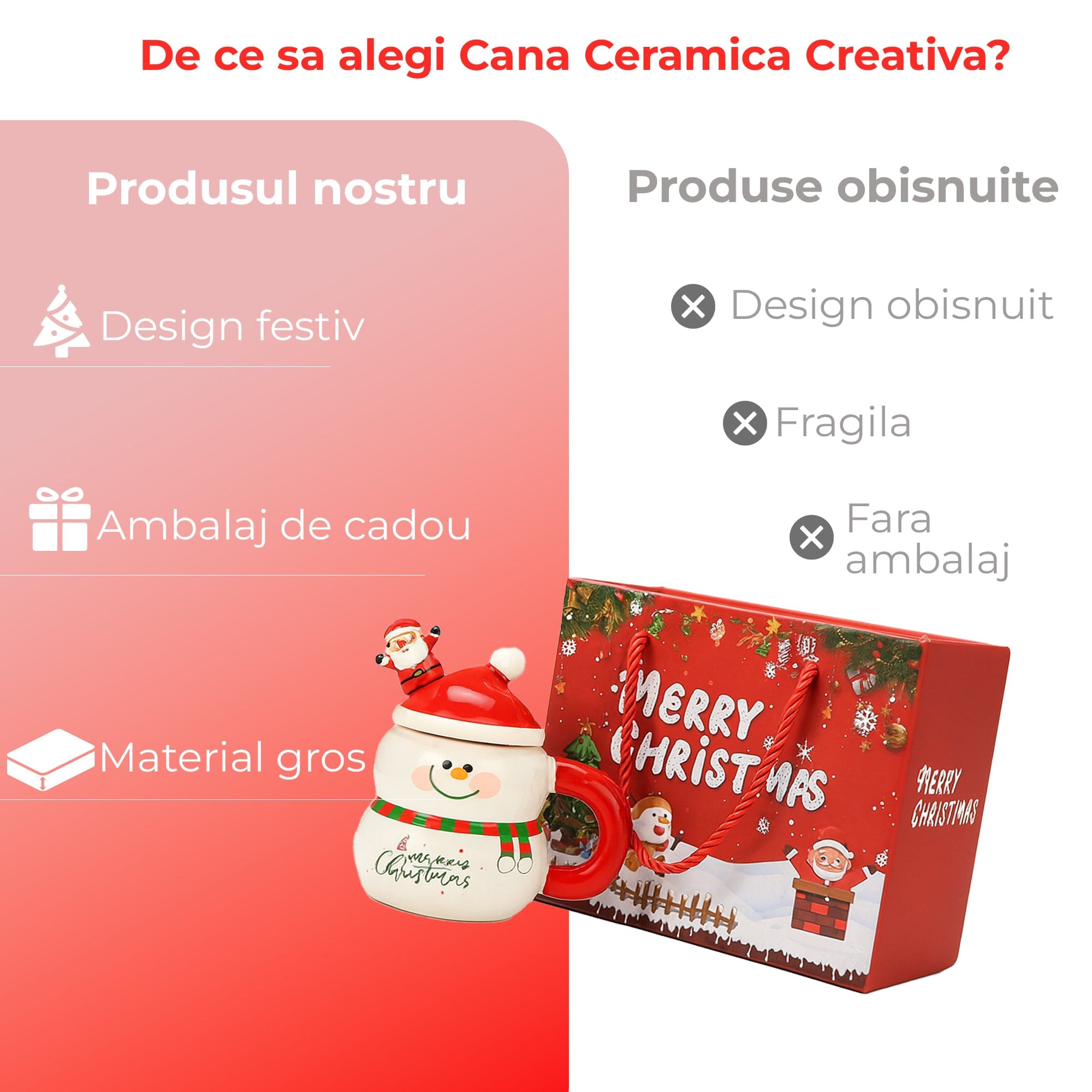 Pe termen lung, investesti intr-un obiect util si versatil, nu doar intr-o decoratiune. O cana Craciun bine construita ramane preferata iarna de iarna, iar capacul protejeaza continutul de praf atunci cand o lasi pe masa. Capacitatea de 400ml ramane versatila pentru cafea, ceai sau ciocolata calda, iar lingurita asortata e mereu la indemana. Pentru cei care apreciaza durabilitatea, ceramica rezistent la temperaturi inalte ofera incredere la fiecare utilizare. Indiferent daca o cumperi pentru tine sau ca dar, aceasta selectie imbina traditia cu functionalul, aducand spiritul sarbatorilor in fiecare zi.