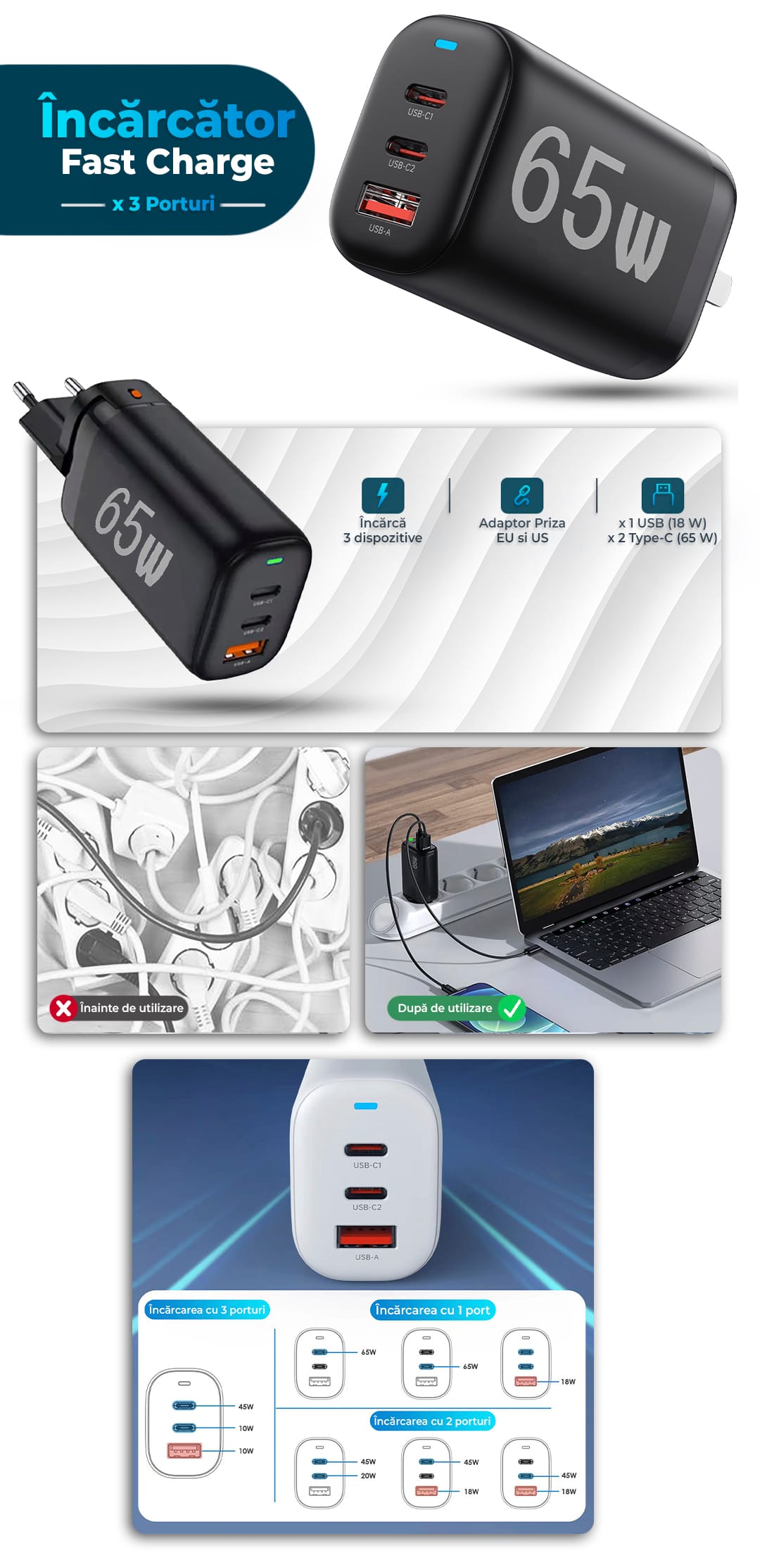 - Incarcare rapida: 65W pentru multiple dispozitive.