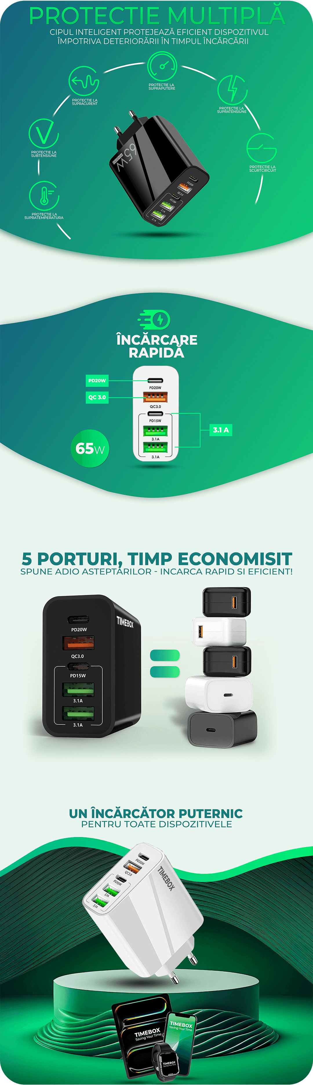 Incarcatorul Timebox de 65W reuseste sa imbine 3 integrari USB si 2 USB-C, fiind companionul perfect atat acasa, cat si in calatorii