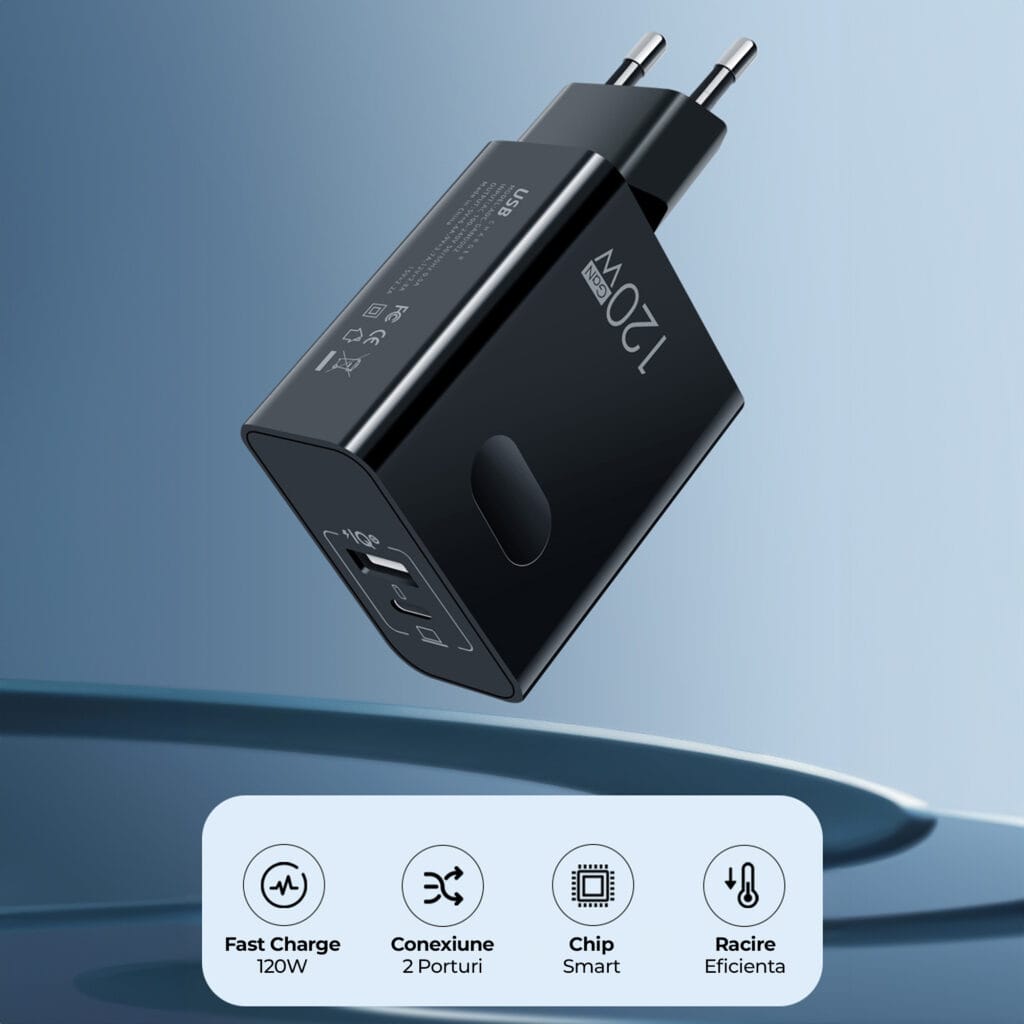 Incarcator Retea Timebox, 2 Porturi, 120W Fast-Charge, 1 x Type-C, 1 x USB Q,C 3,0, Negru