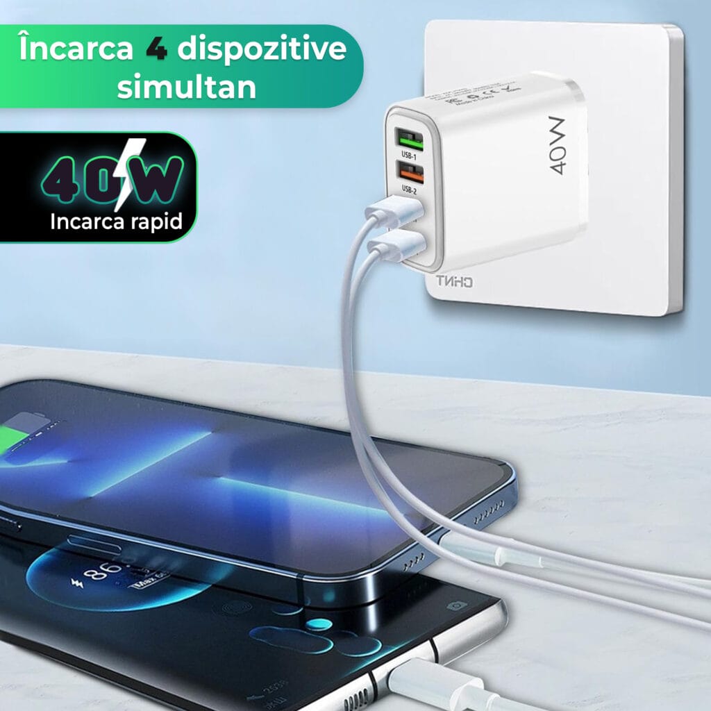 - Fast Charge 40W: Cu o putere de 40W, acest încărcător asigură o încărcare rapidă și eficientă a dispozitivelor tale, economisind timp și energie.