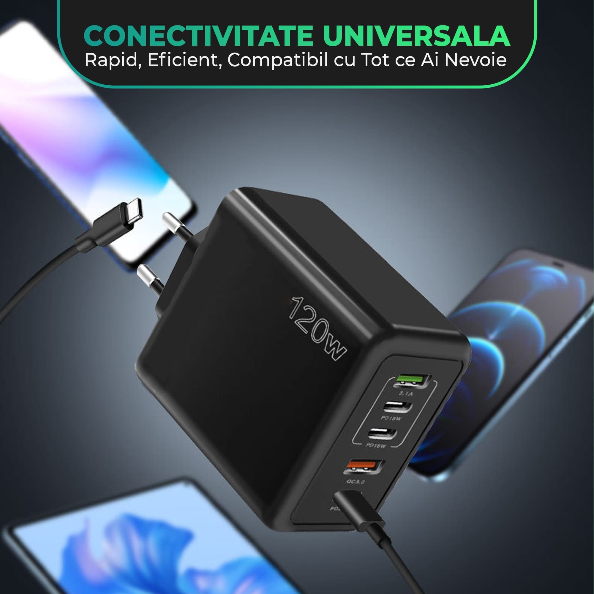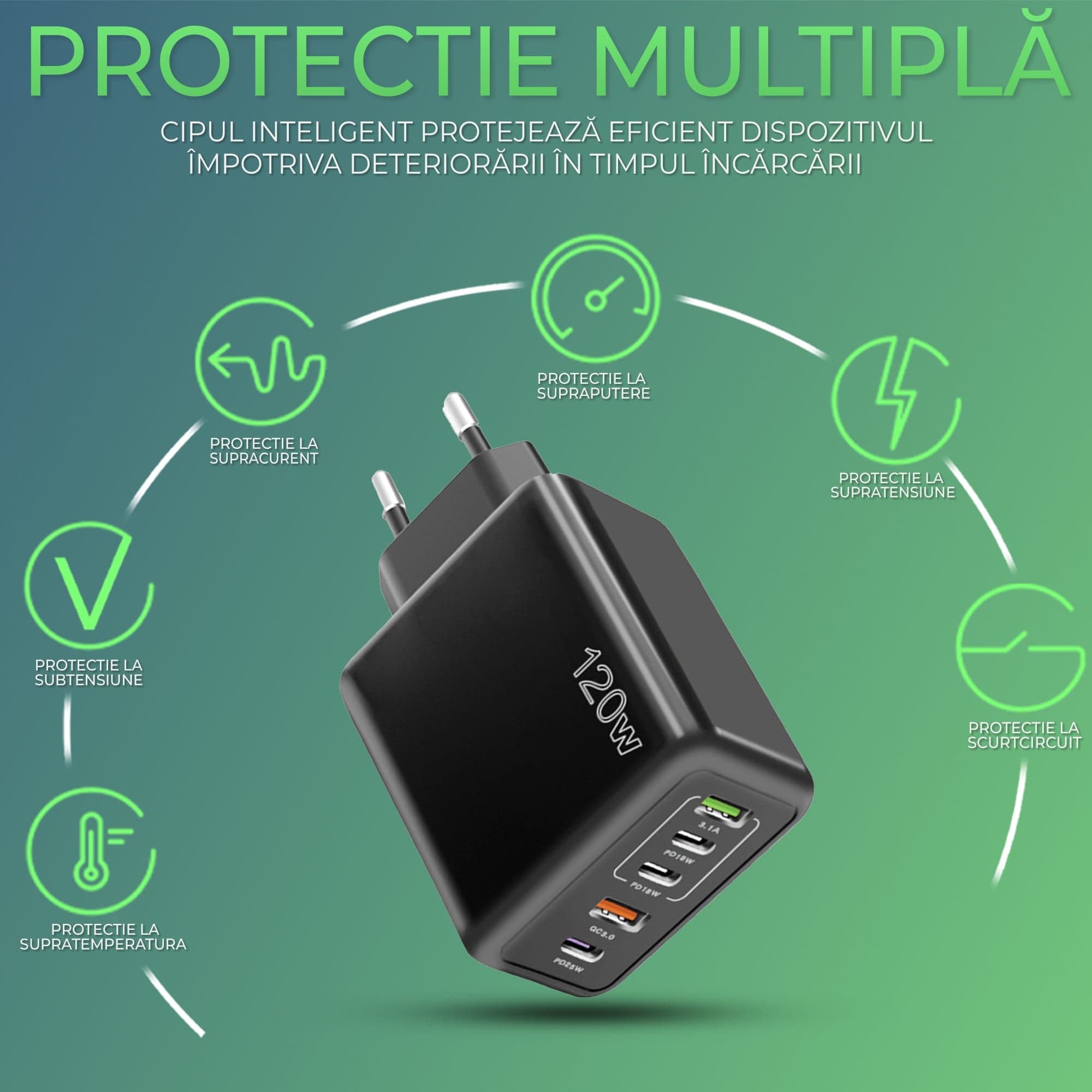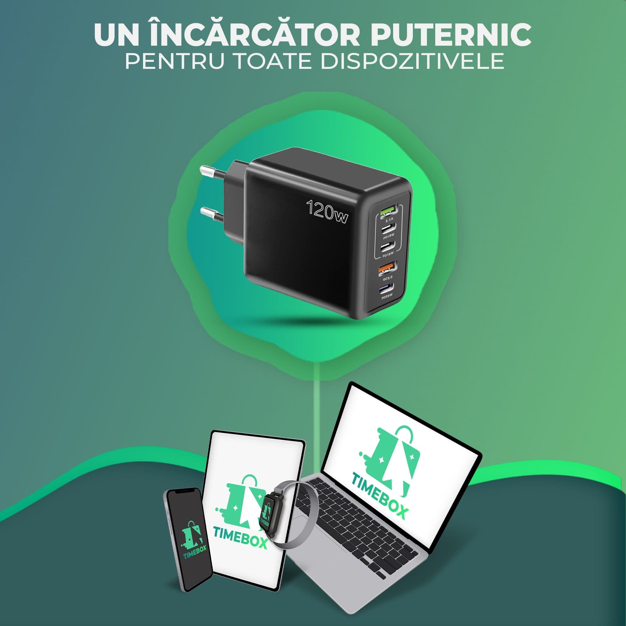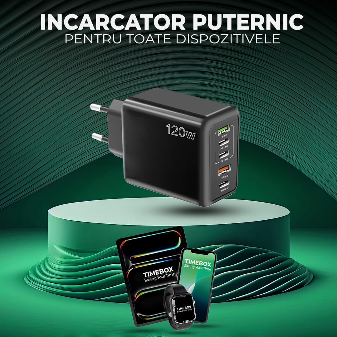 - Putere impresionanta: Incarcatorul de retea Timebox ofera o putere totala de 120W, asigurand incarcarea rapida si eficienta a tuturor dispozitivelor tale.