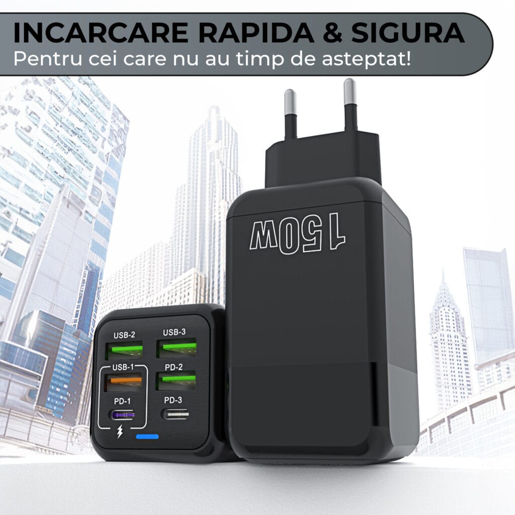Incarcator Retea Timebox, 6 Porturi, 3 x USB, 3 x Type-C, 150W Fast Charge, LED, Negru