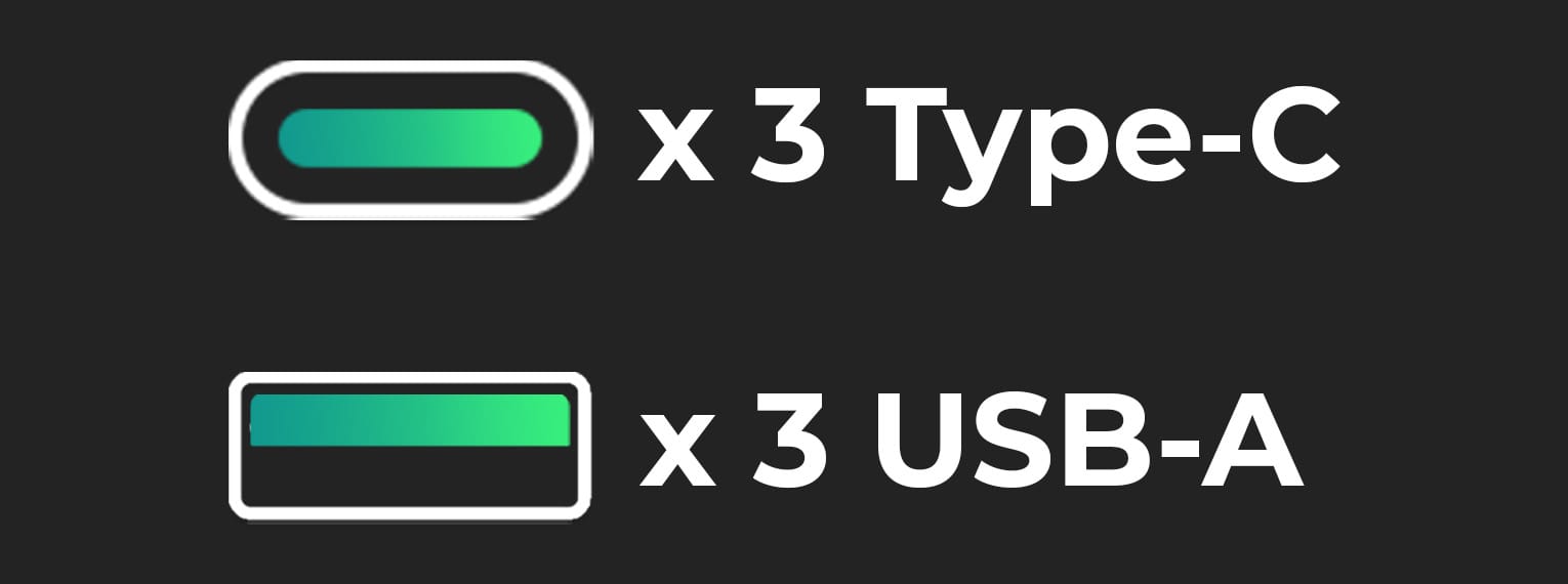 - 6 Porturi de incarcare: Dispune de 3 porturi USB si 3 porturi Type-C, permitandu-ti sa incarci simultan pana la sase dispozitive, oferind flexibilitate maxima.