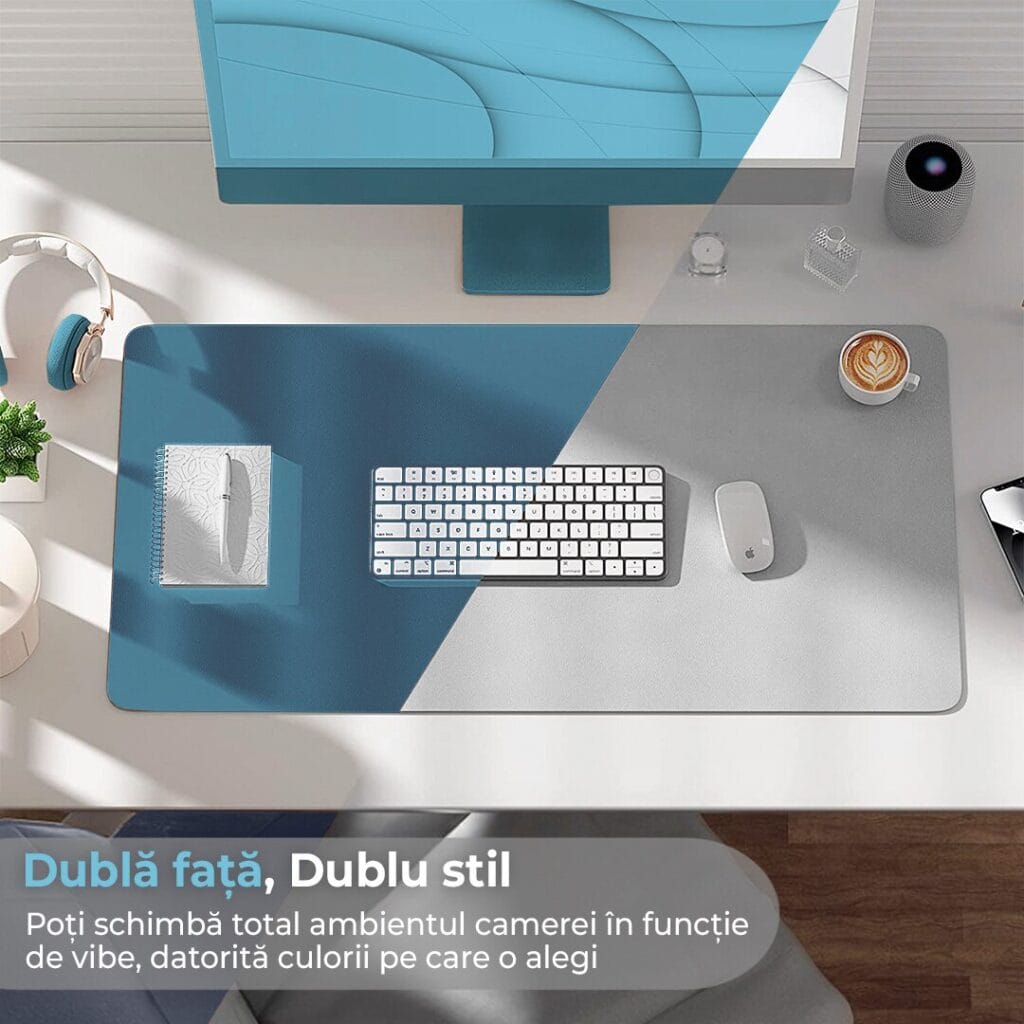 - Doua fete din piele PU: Designul reversibil cu doua fete din piele PU de inalta calitate, in culori albastru deschis si gri, permite schimbarea usoara a aspectului biroului tau, adaugand versatilitate si stil.