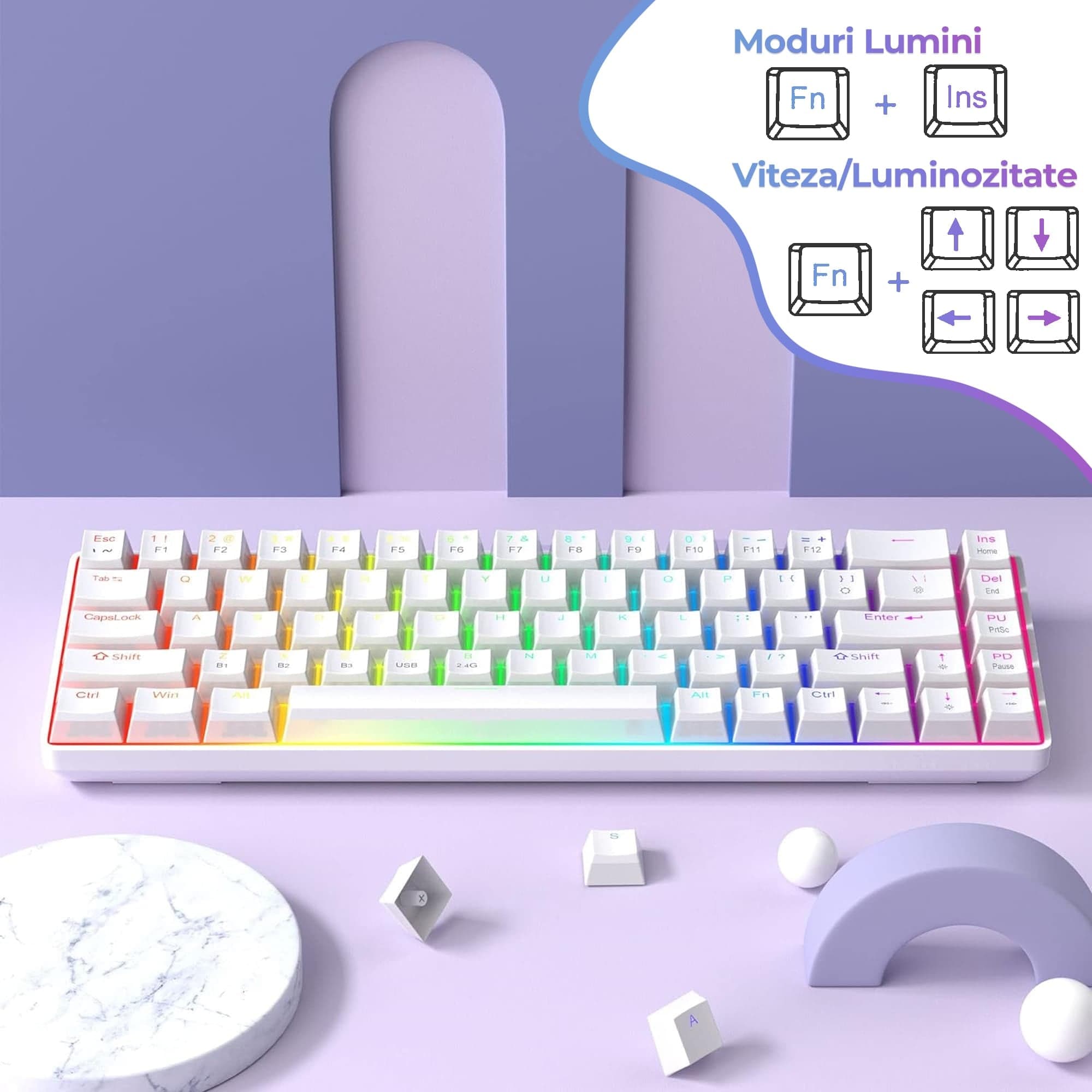 ⌨️ Tastatura Mecanica Gaming Timebox, Wireless, Layout 60%, lumini LED, 68 taste PBT Pudding Keycaps, Bluetooth, 2.4G, cablu Type-C, Red Switch, Portabila, Compatibila Windows, Mac, Alb ⌨️